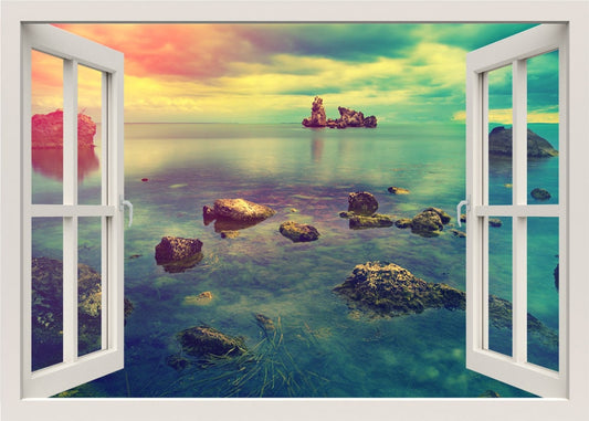 Sea Wall Decal Mural, Sunset Mural, Rocks and Clouds Wall Decal, Nature Wall Sticker, 3d Window View, Living Room Bedroom Home Decor
