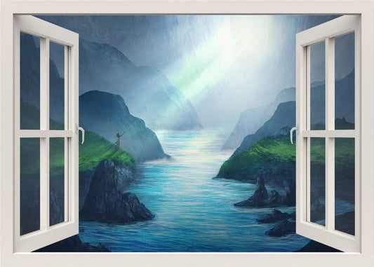 Mountains Wall Decal, Sea Mountains Wall Mural, Fantasy Nature Wall Sticker, 3d Window View Sticker, Home Living Room Wall Decor