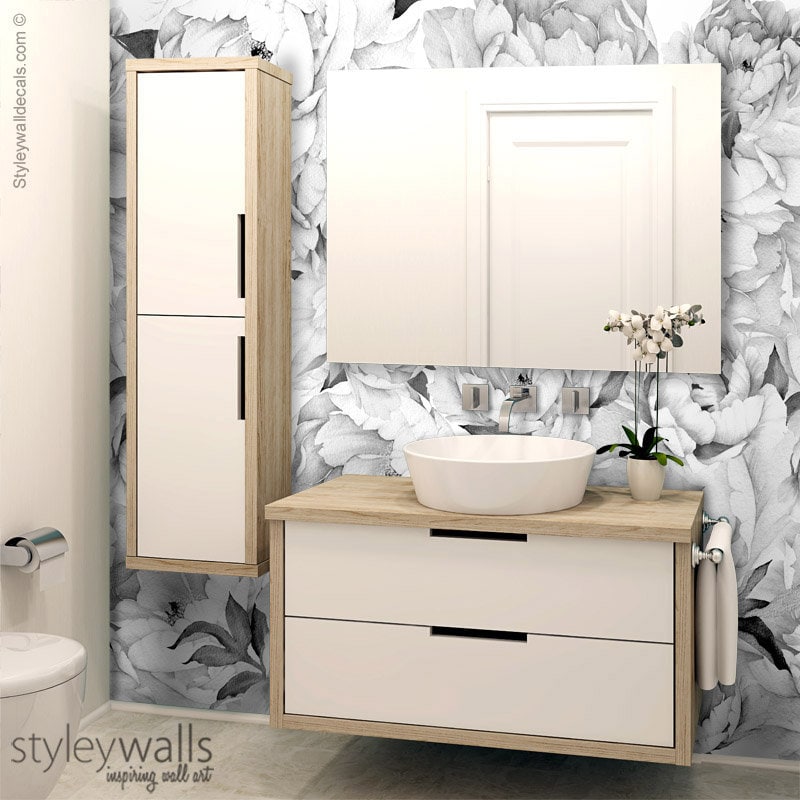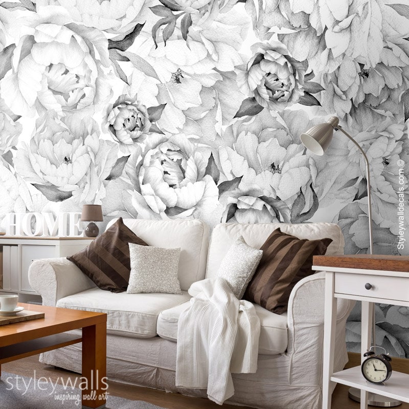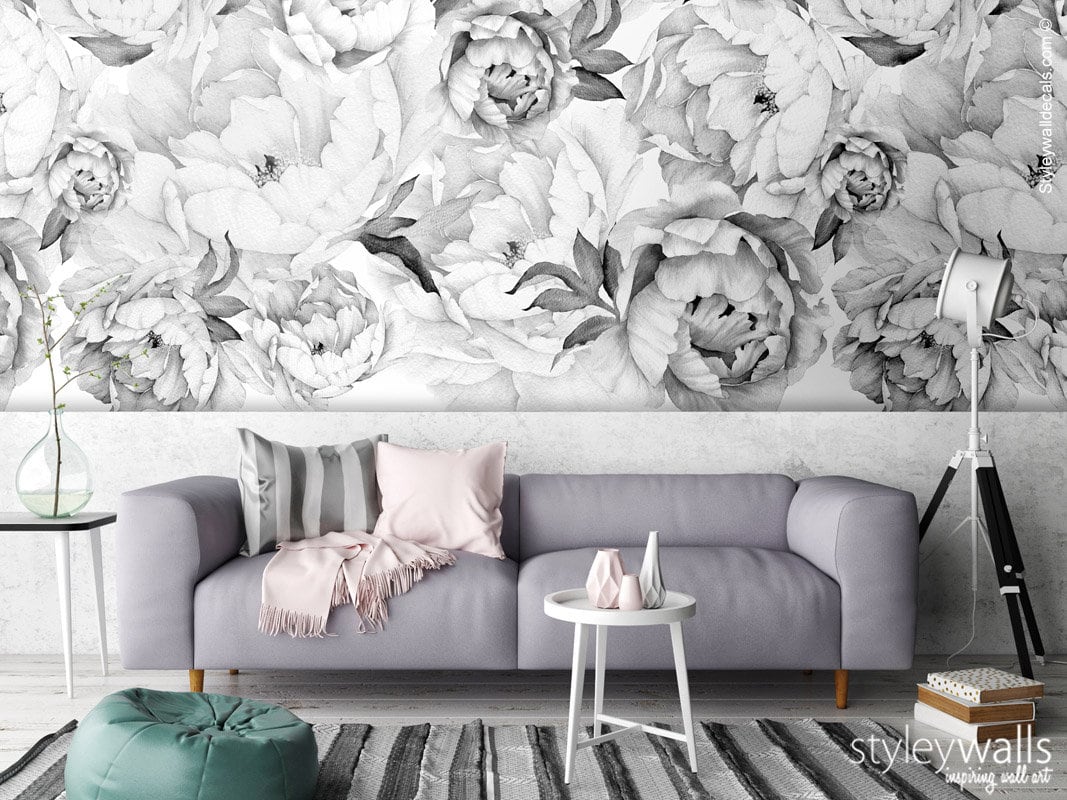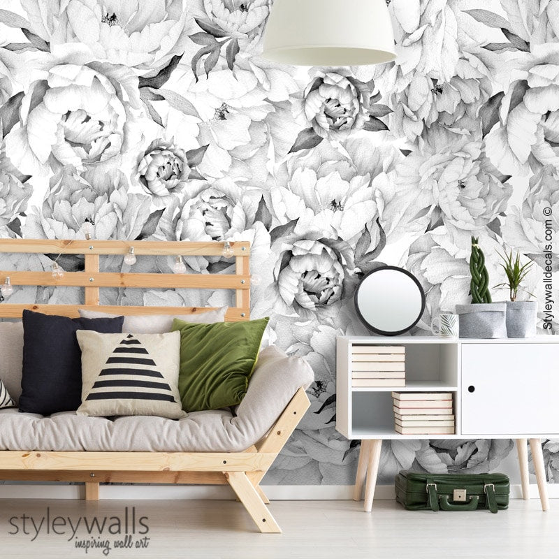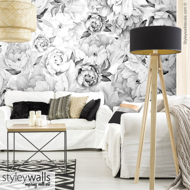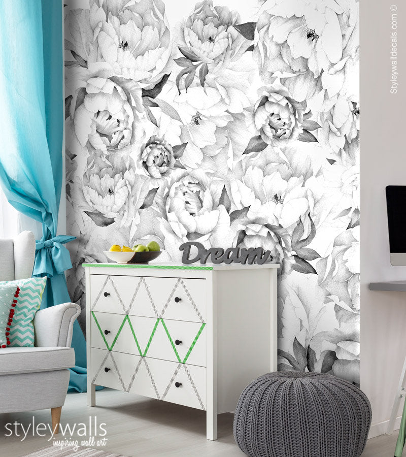 Pfingstrosen-Tapete, Pfingstrosen-Wandbild, Pfingstrosen-Blumentapete, Schwarz-Weiß-Aquarell-Blumen-Tapete, repositionierbarer Stoff