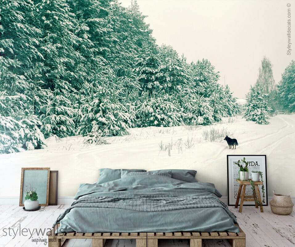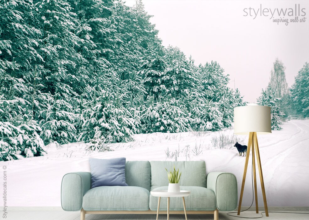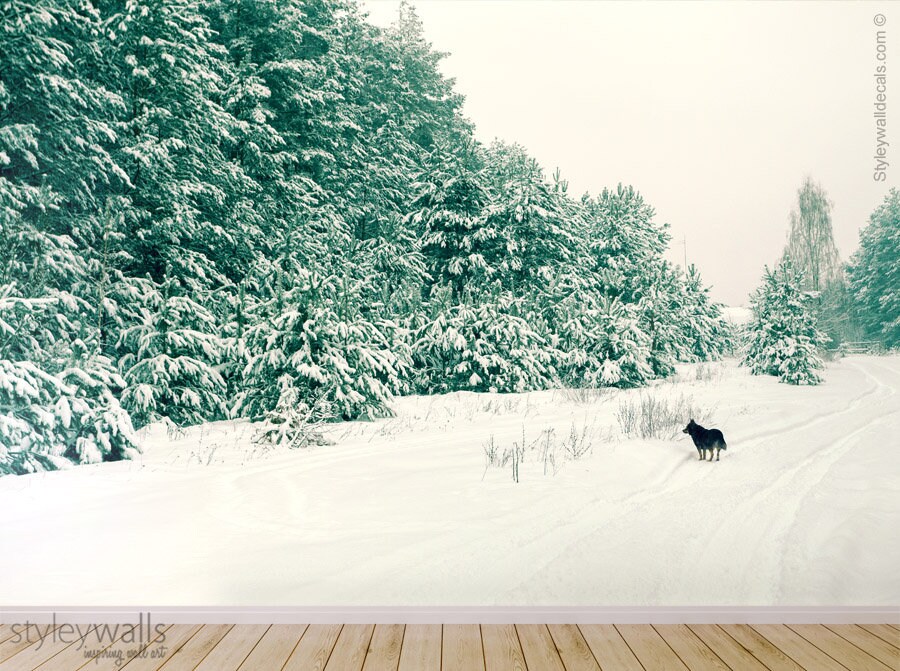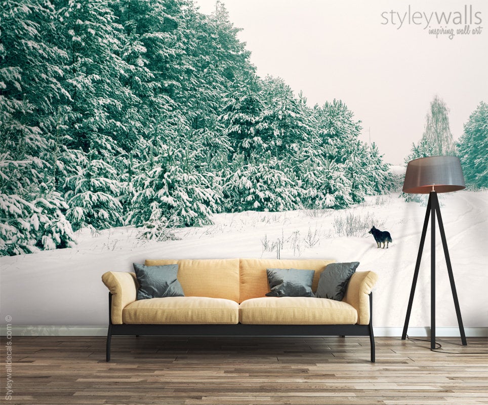 Snow Mural, Pine Trees Mural, Winter Forest Trees Mural, Repositionable Removable Fabric Wallpaper, Room Decor, Peel and Stick Self Adhesive