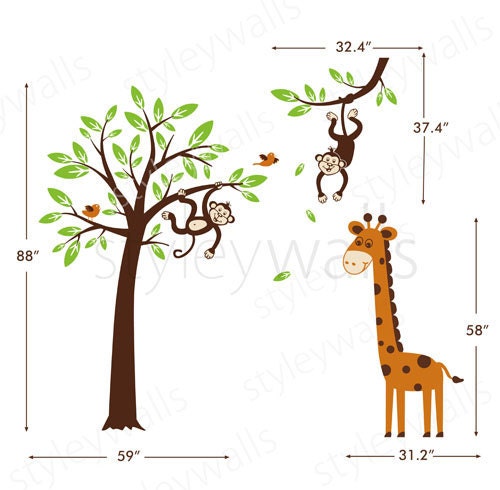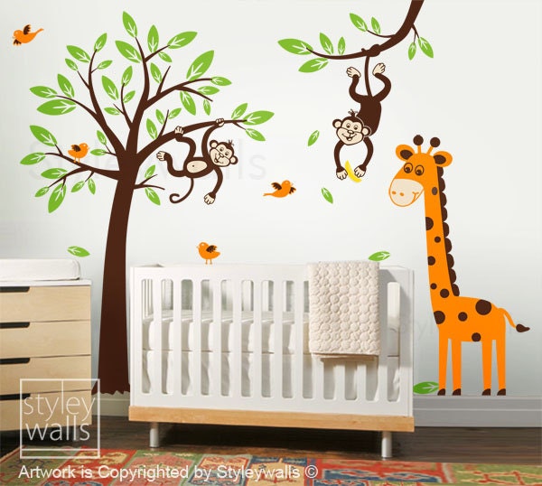 Tree Wall Decal, Monkey and Giraffe Wall Decal, Monkey Wall Decal, Giraffe Wall Decal, Jungle Animals Wall Decal for Baby Nursery Kids Room
