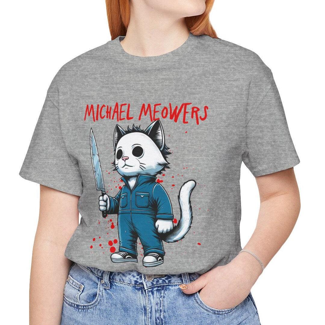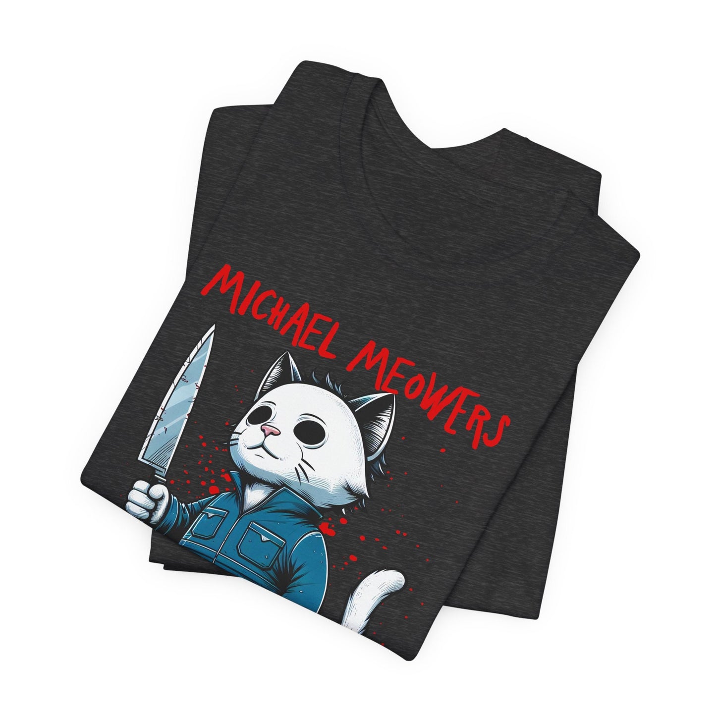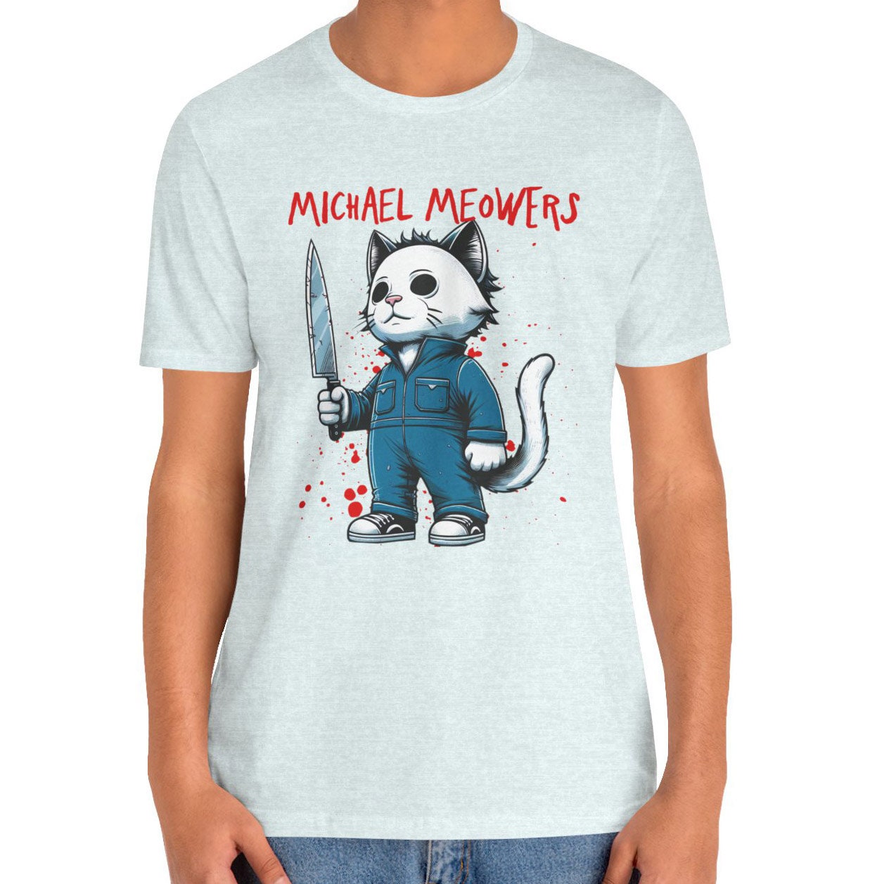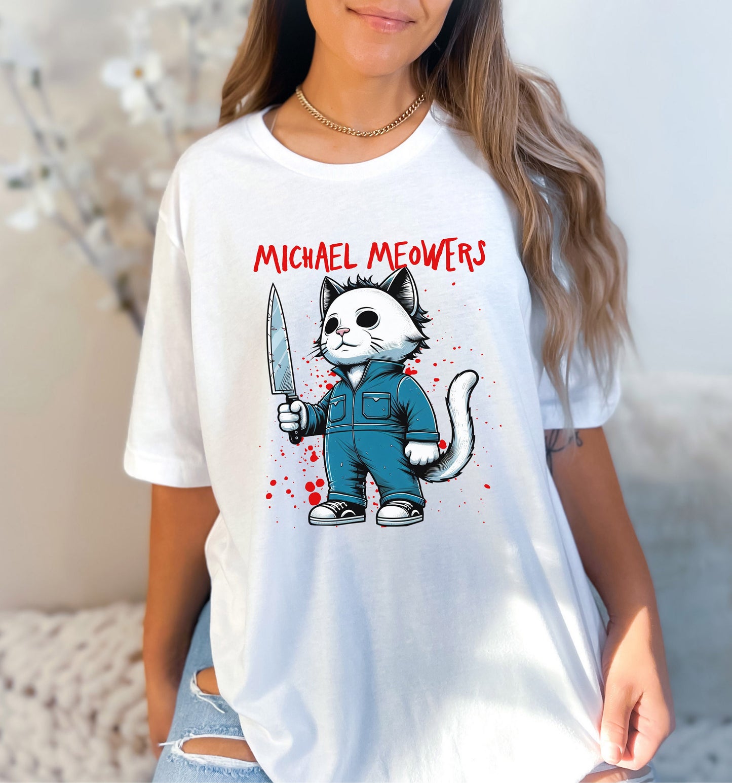 T-shirt Michael Meowers Cat, T-shirt parodique de film d'horreur, T-shirt d'Halloween, T-shirt drôle de chat, T-shirt cadeau pour amoureux des chats, T-shirt de chat effrayant