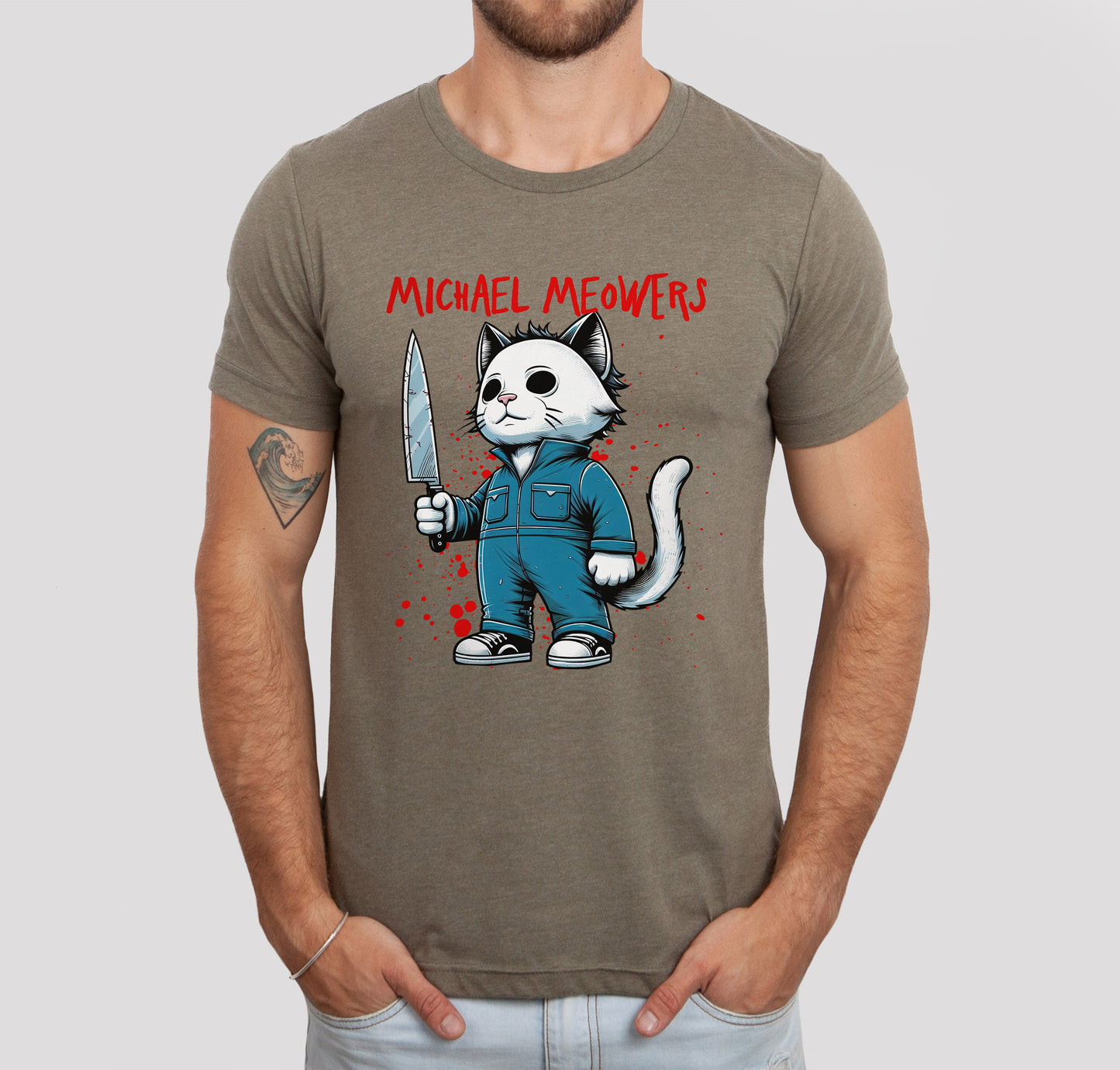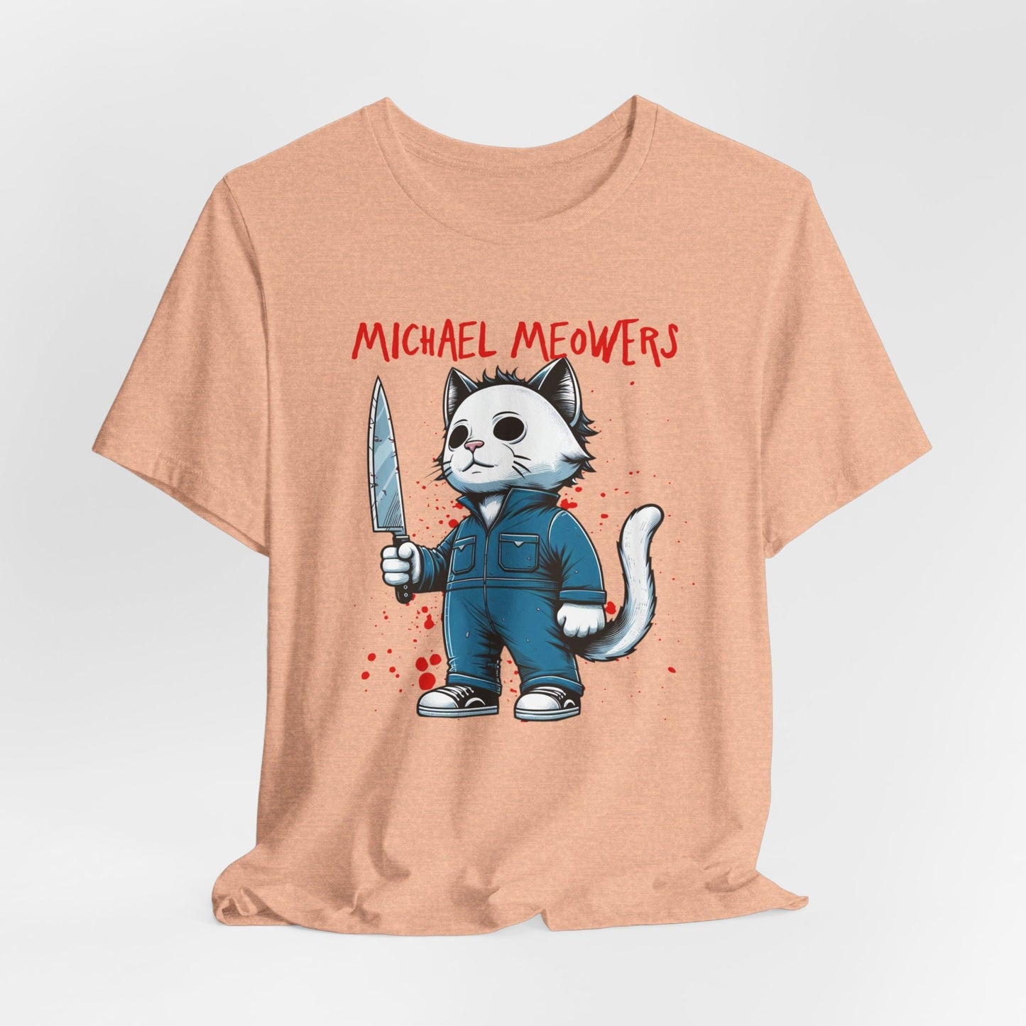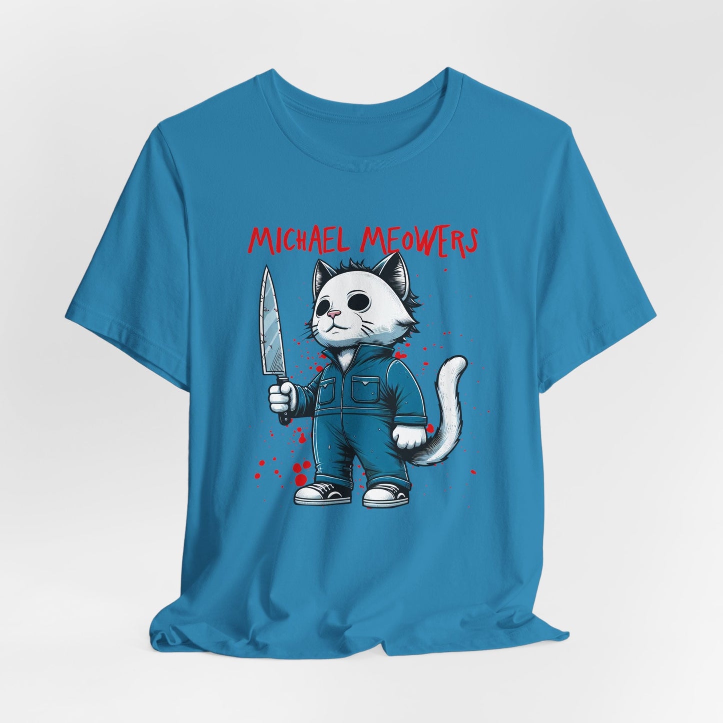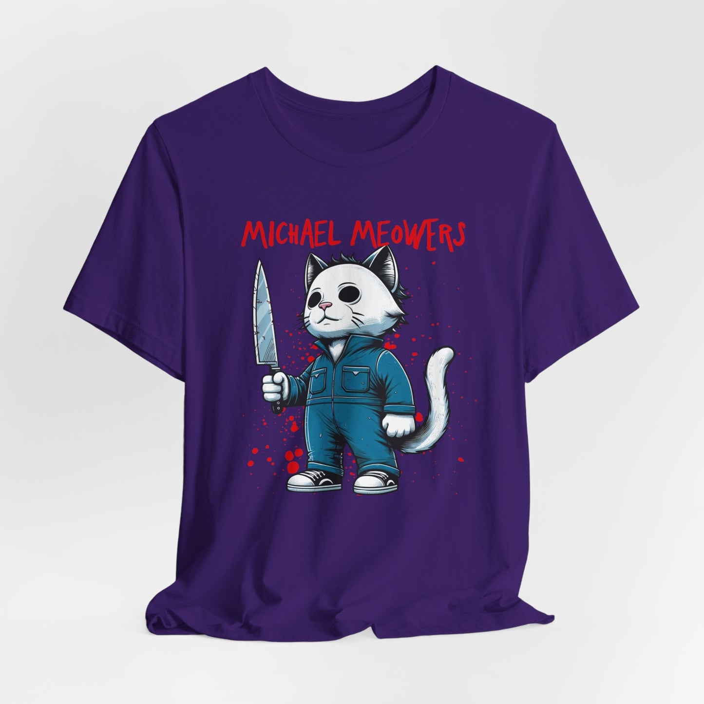 T-shirt Michael Meowers Cat, T-shirt parodique de film d'horreur, T-shirt d'Halloween, T-shirt drôle de chat, T-shirt cadeau pour amoureux des chats, T-shirt de chat effrayant