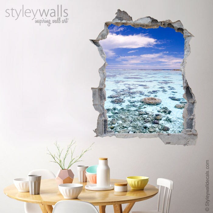 Sticker mural avec vue sur la mer, décoration murale avec rochers, autocollant mural effet 3D avec trou dans le mur, autocollant mural 3D, décoration de bureau à effet 3D pour mur cassé