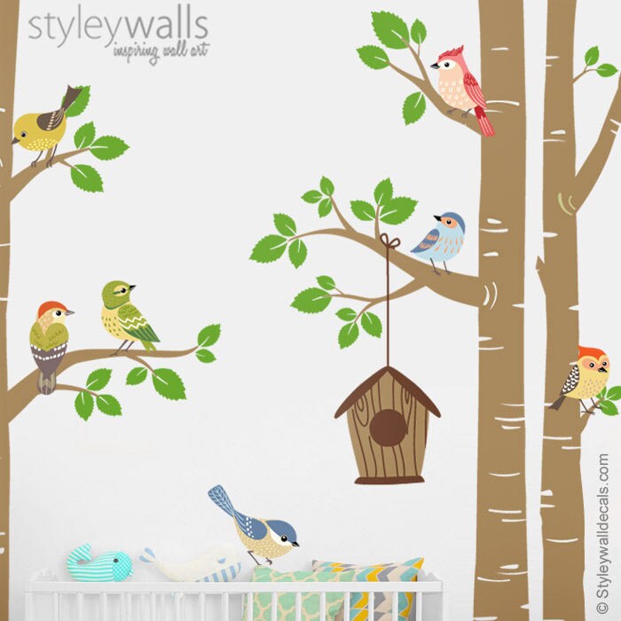 Autocollant mural arbres et oiseaux, autocollant mural arbres et oiseaux de la forêt, autocollant mural arbres, décoration murale chambre d'enfant oiseaux, décoration murale chambre bébé arbres
