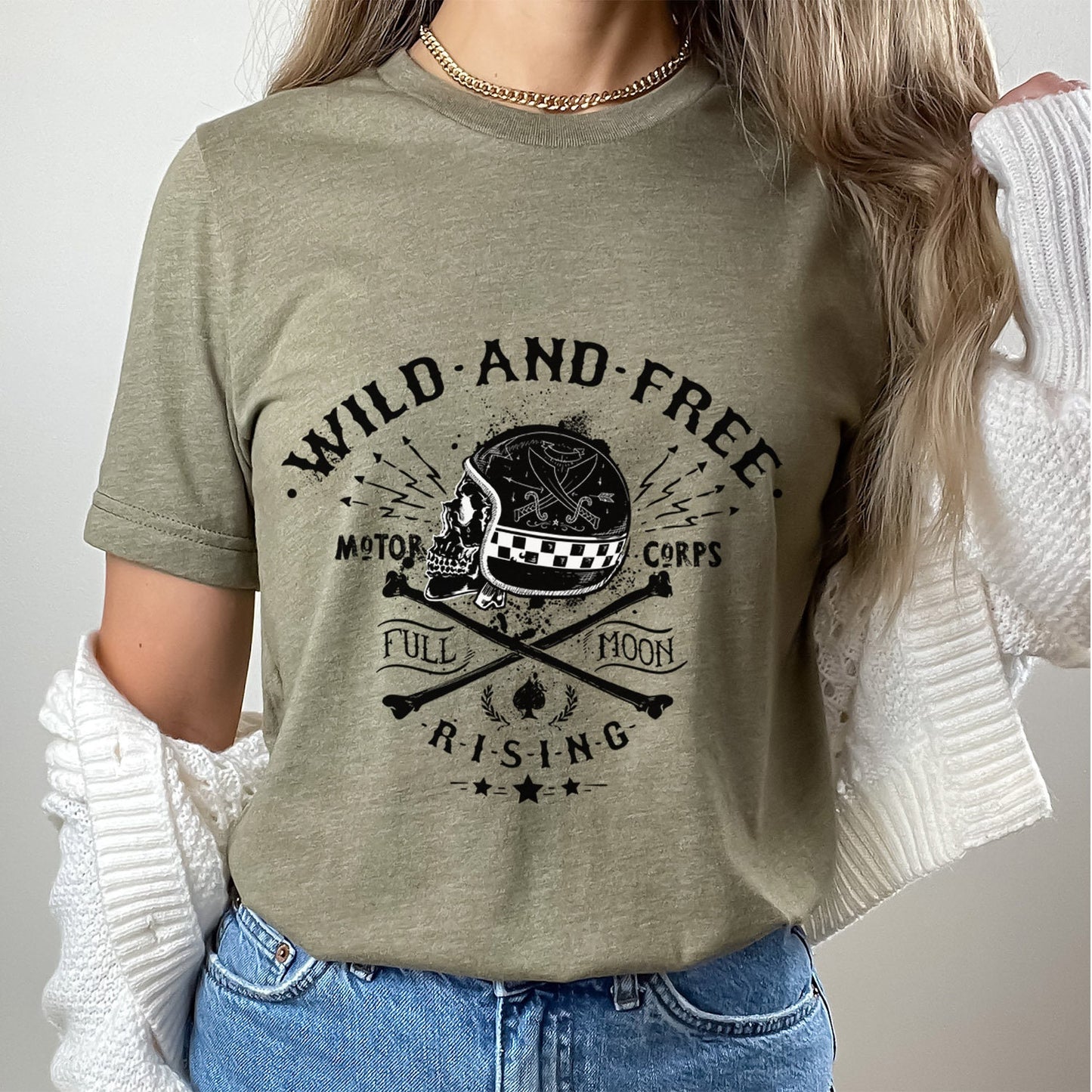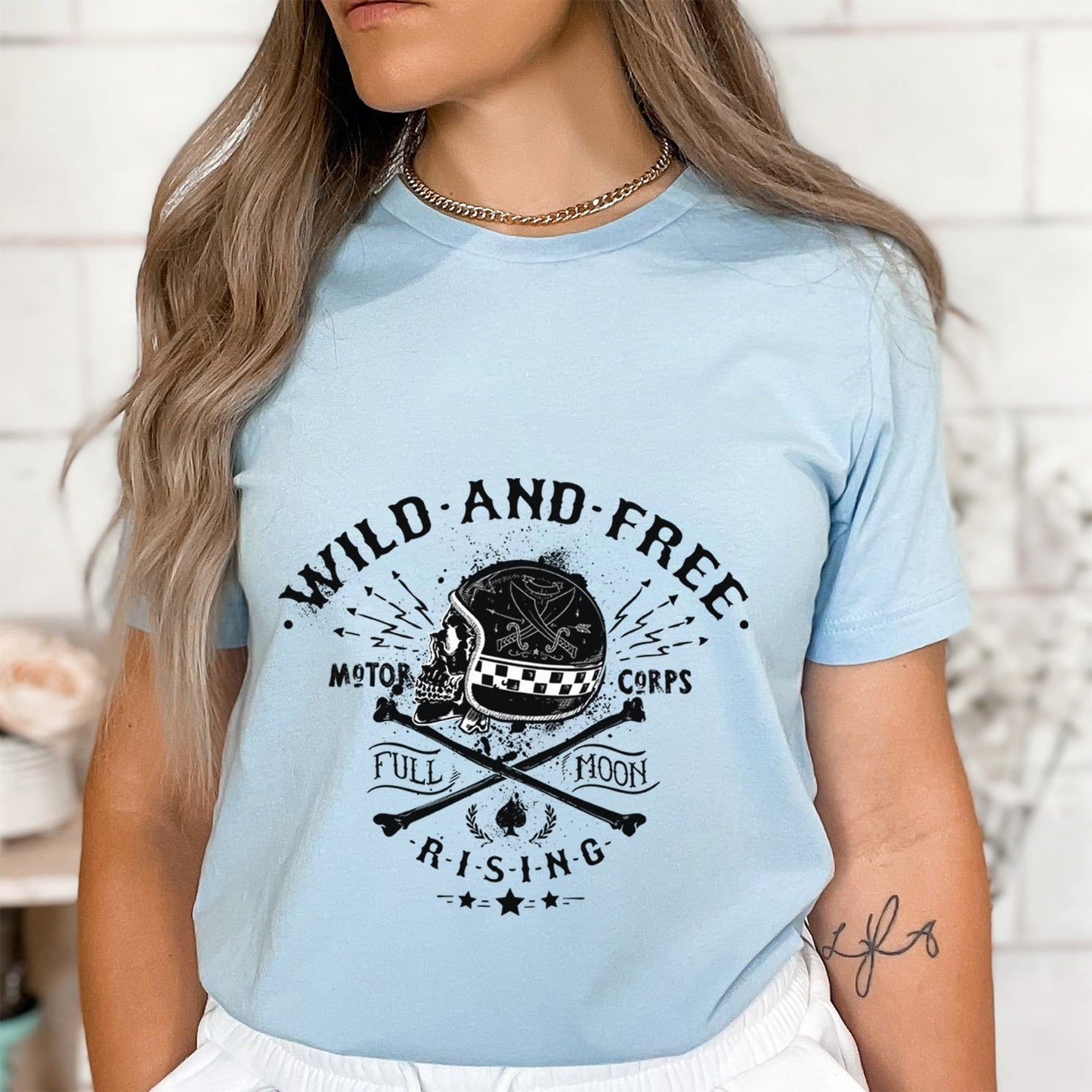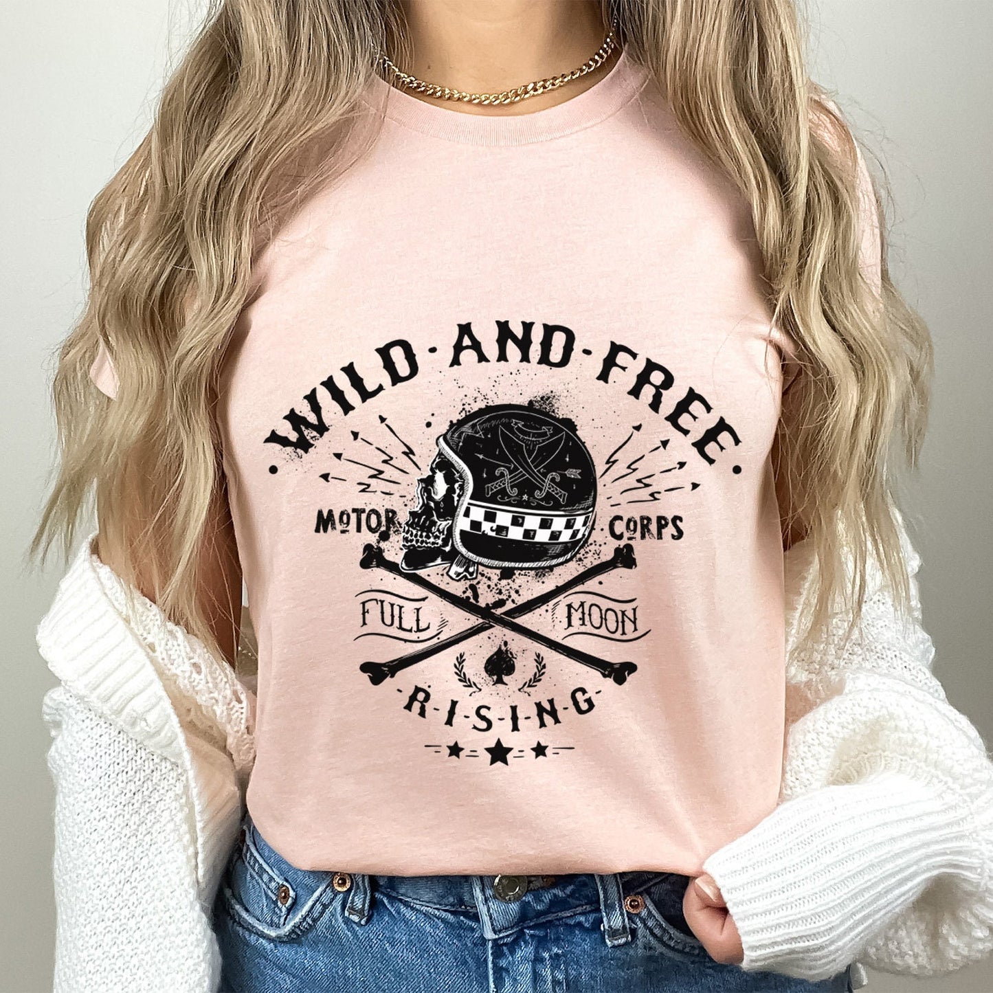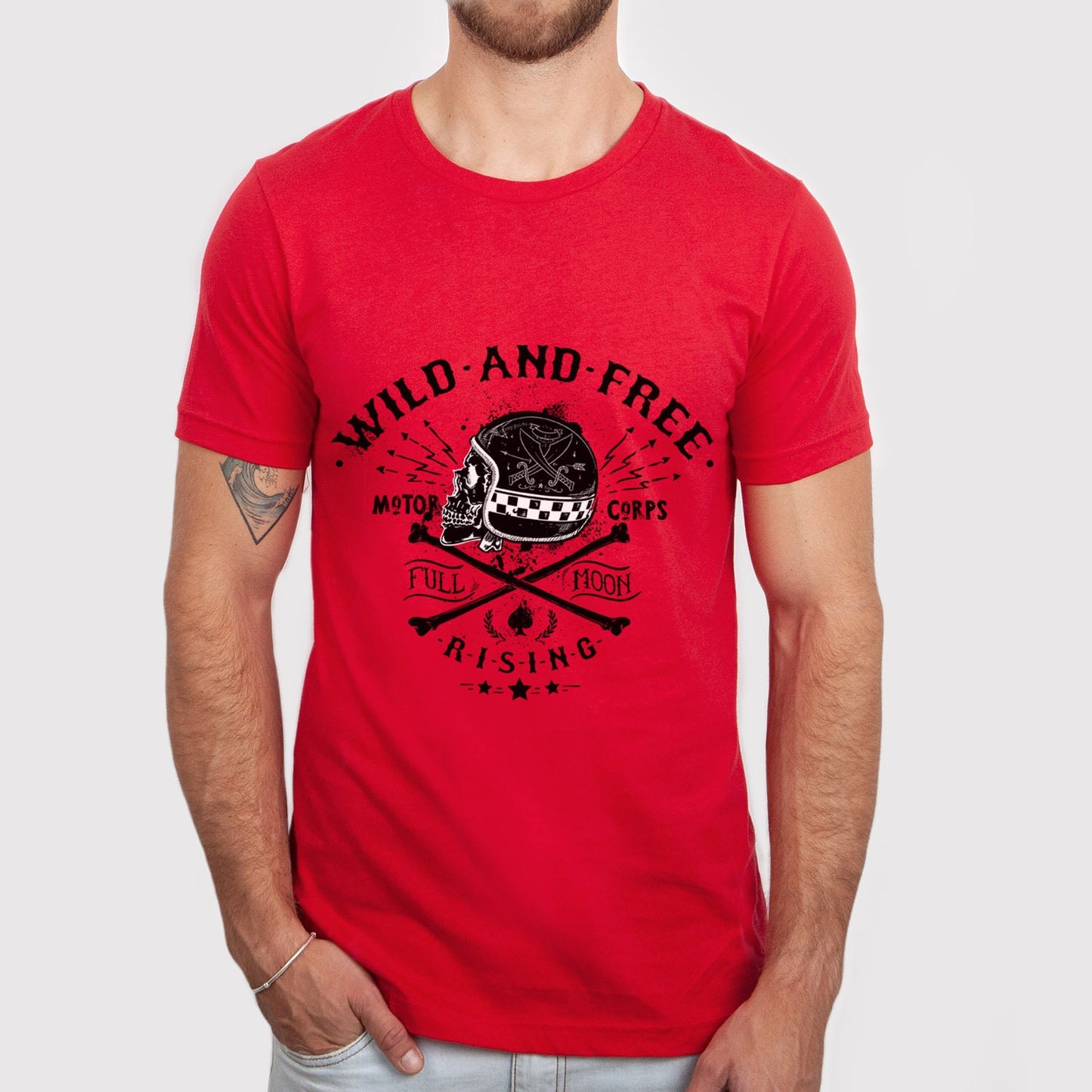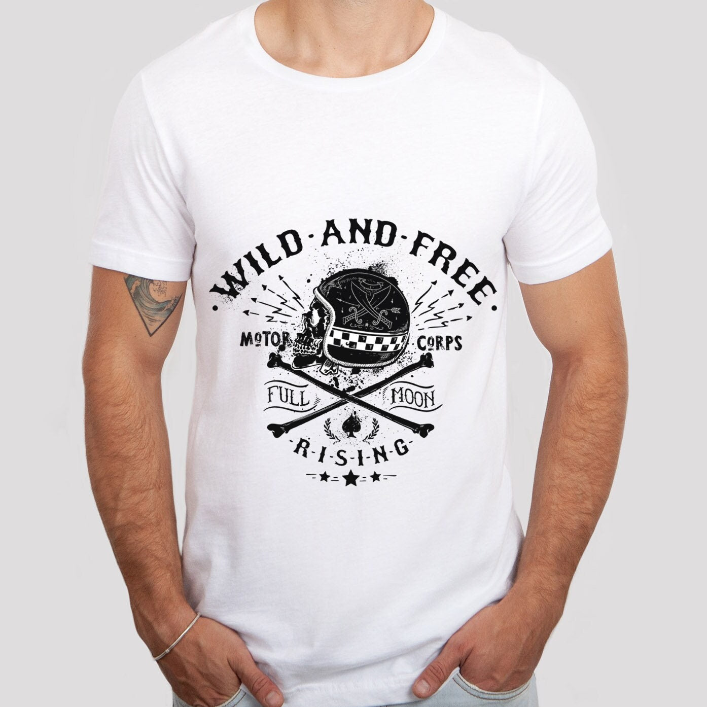 T-shirt Wild and Free, T-shirt avec squelette, T-shirt moto, T-shirt motards, T-shirt motards, crâne et feu, cadeaux moto