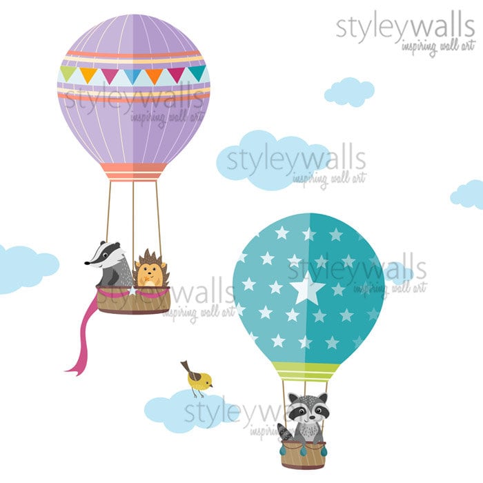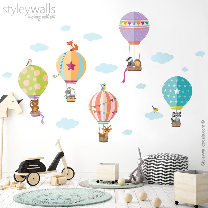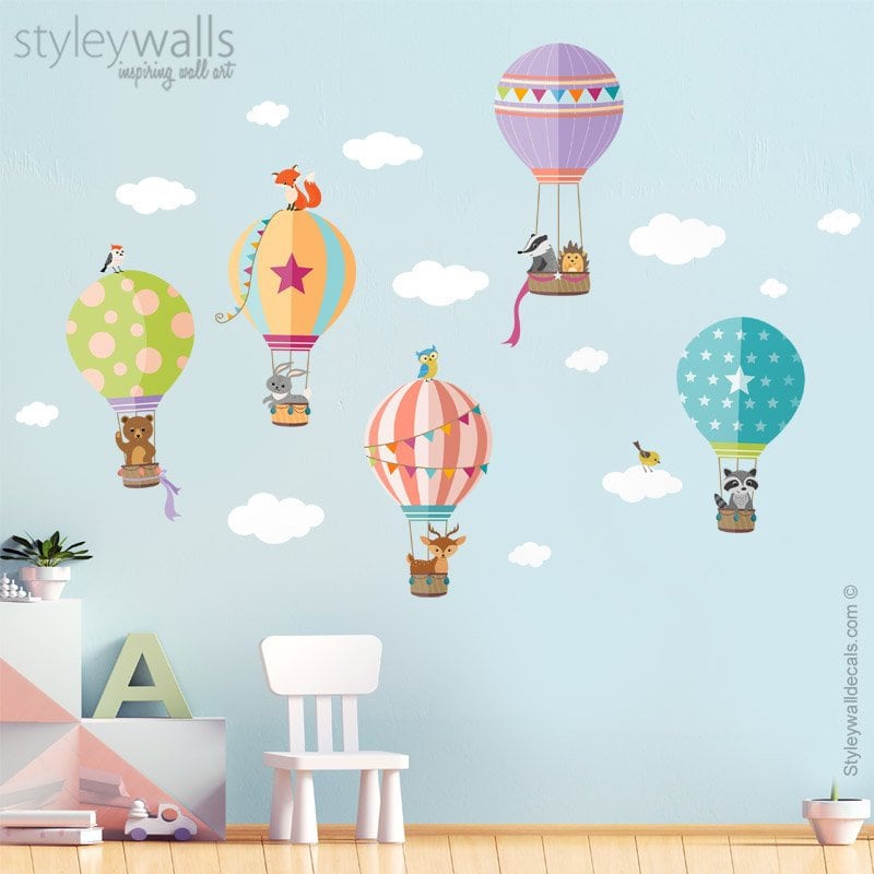 Air Balloons Wall Decal, Woodland Animals Wall Decal, Forest Animals Hot Air Balloons Wall Sticker, Baby Nursery Decor, Kids Room Wall Decal