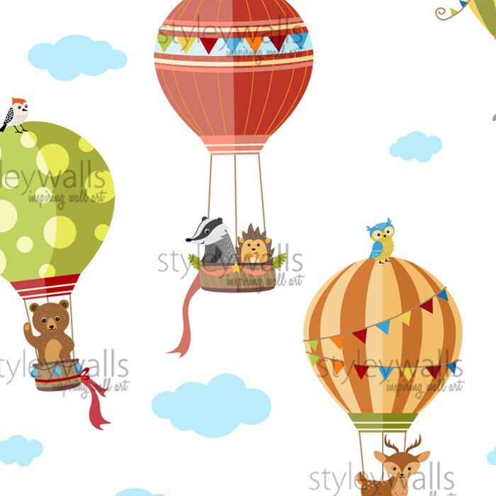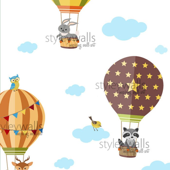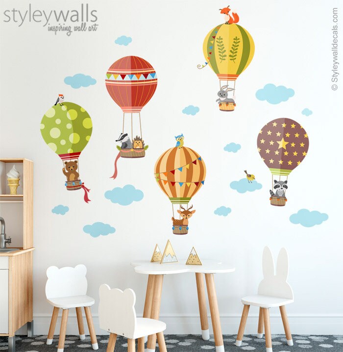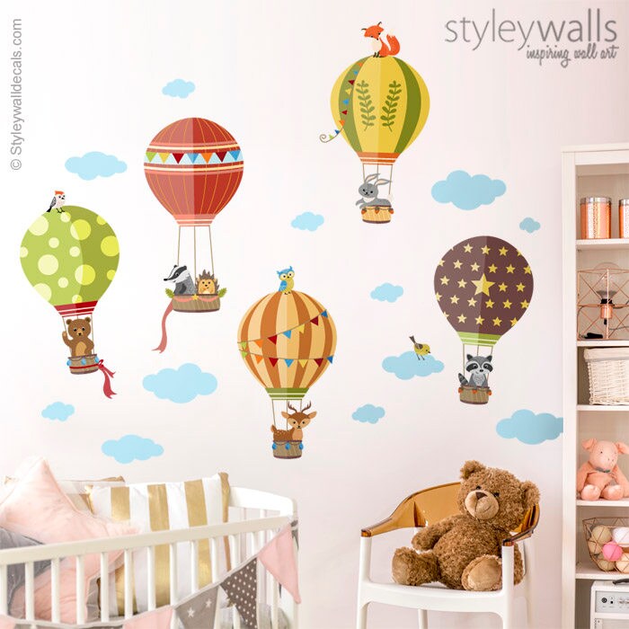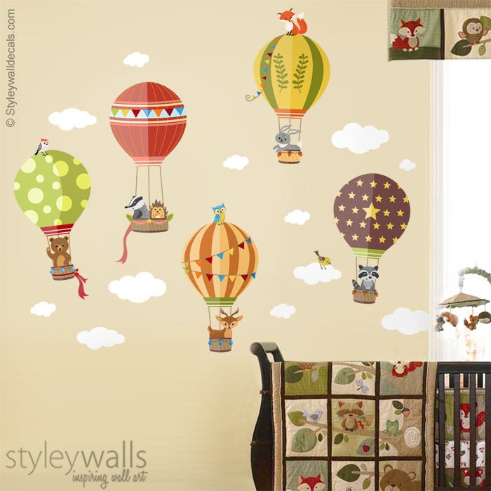 Air Balloons Wall Decal, Woodland Forest Animals Wall Decal Sticker, Hot Air Balloons Wall Sticker, Baby Nursery Decor, Kids Room Decal