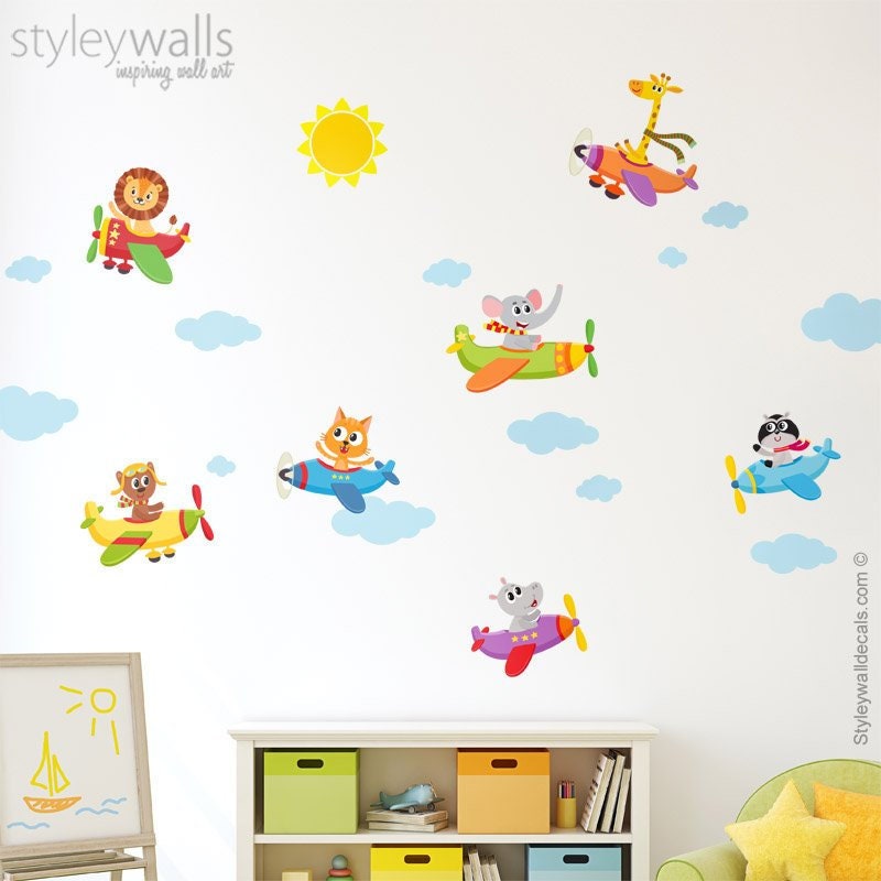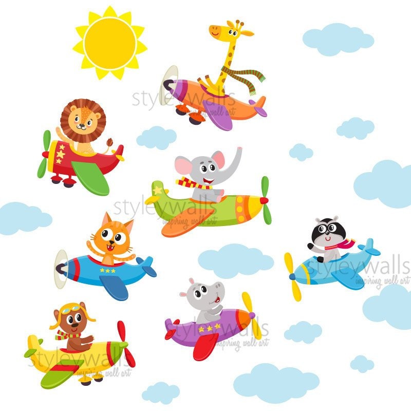 Airplanes Wall Decal, Airplanes Wall Sticker, Animals with Airplanes Wall Decal, Flying Airplanes Jungle Safari Kids Nursery Baby Room Decor