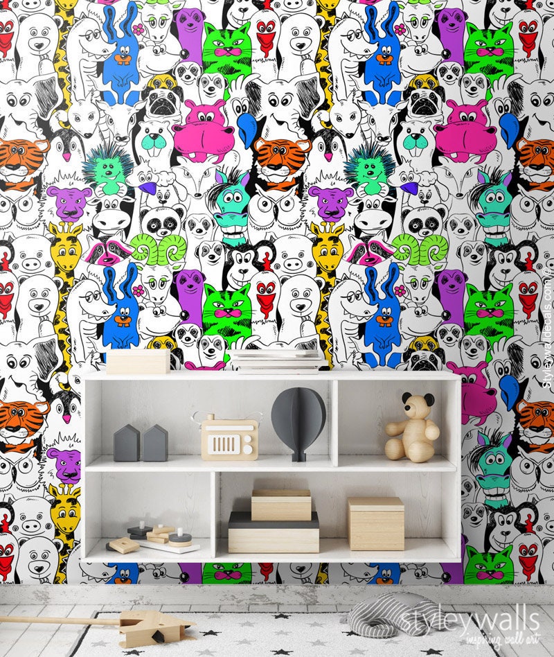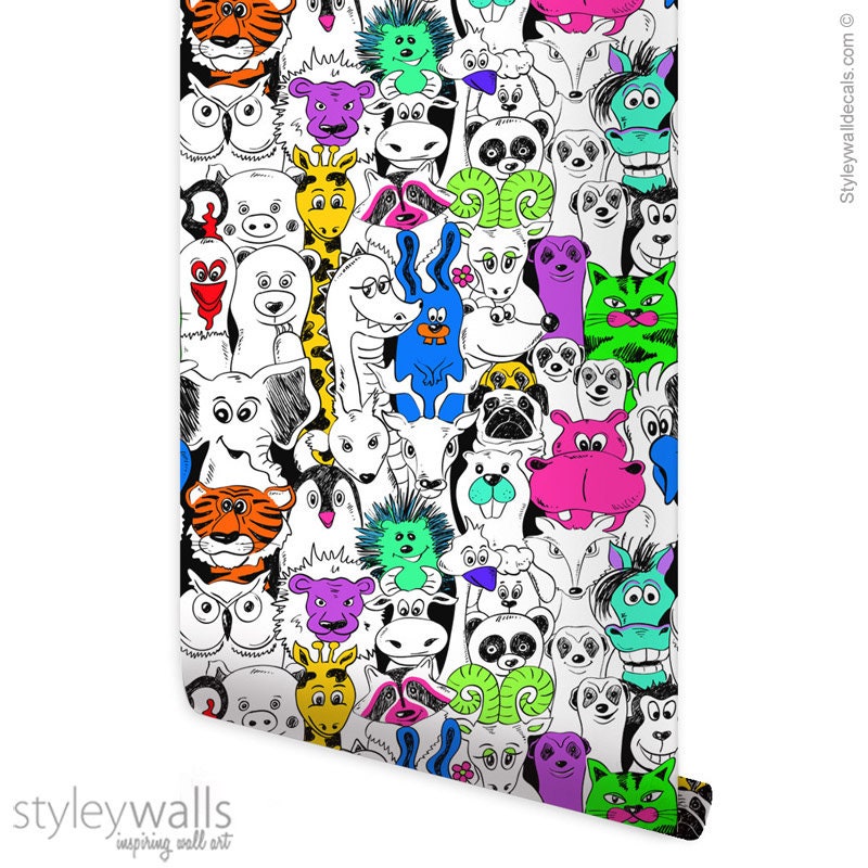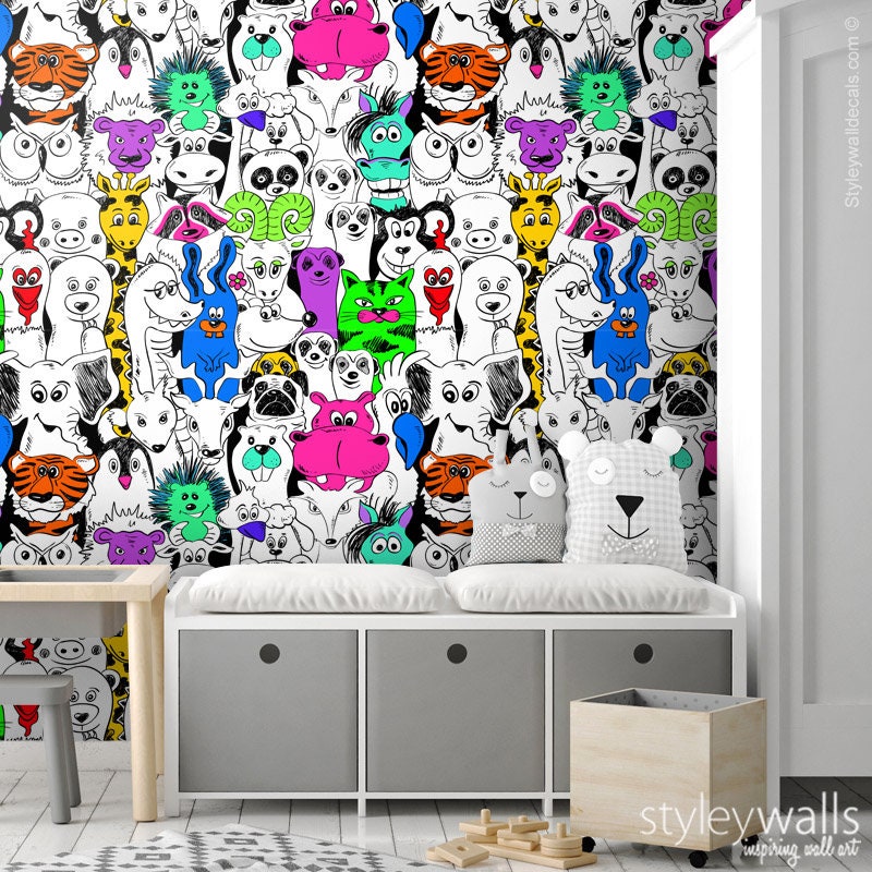 Animals Wallpaper, Kids Room Wallpaper, Pop Art Style Repositionable Removable Fabric Wallpaper, Peel and Stick, Self Adhesive
