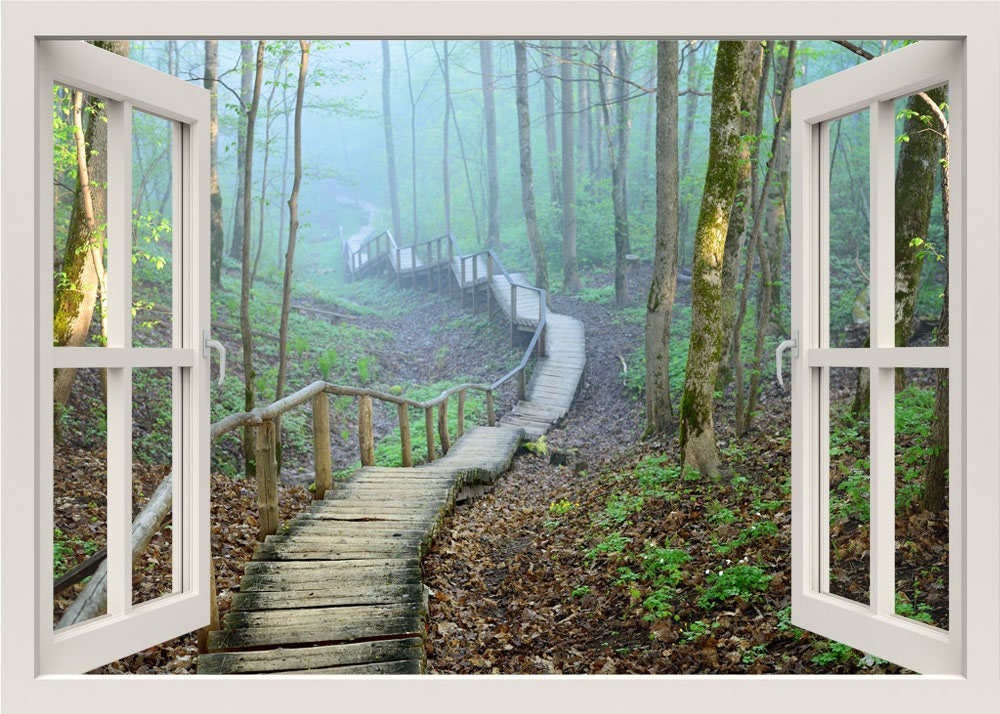 Bridge in a Forest Wall Decal, 3d Window Wall Decal, Window View Wall Mural, Window Frame, Nature Wall Decal, Living Room Home Wall Decor