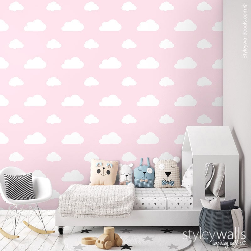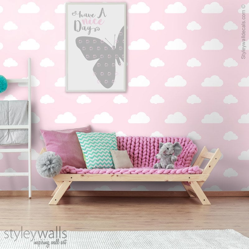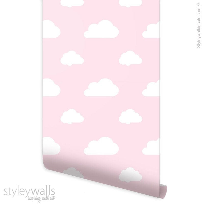 Clouds Wallpaper, White Pink Clouds Pattern Wallpaper, Repositionable Self Adhesive Fabric Wallpaper, Girls Room Decor, Peel and Stick