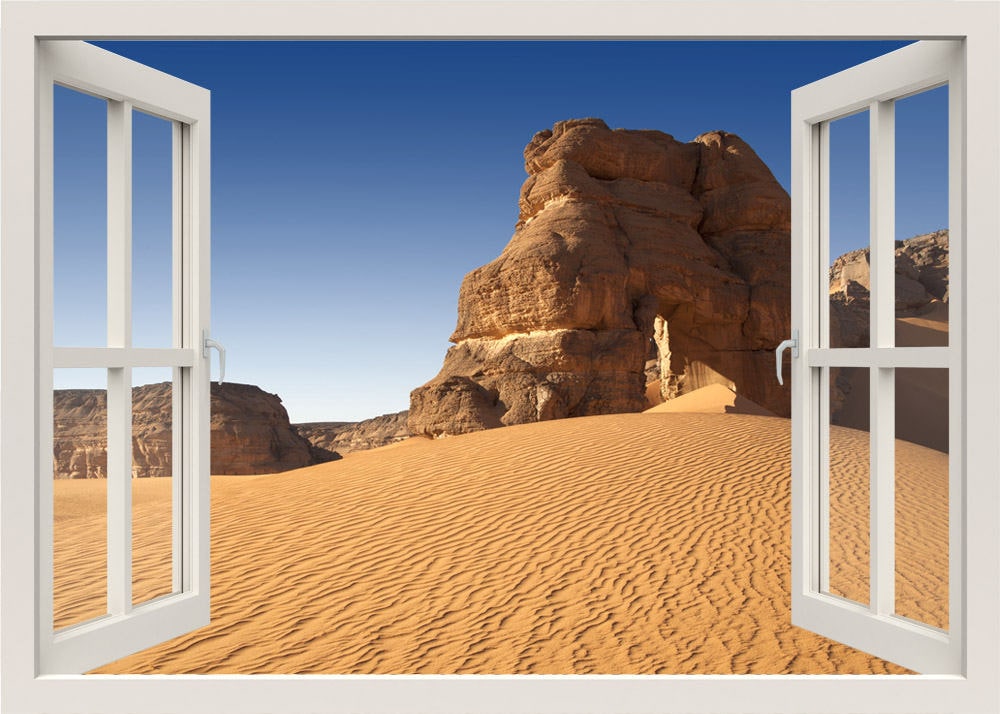 Desert View Wall Decal, Rock in a Sandy Desert Wall Decal, 3d Window View Nature Wall Decal, Desert Wall Sticker Mural, Home Wall Decor