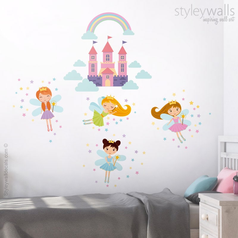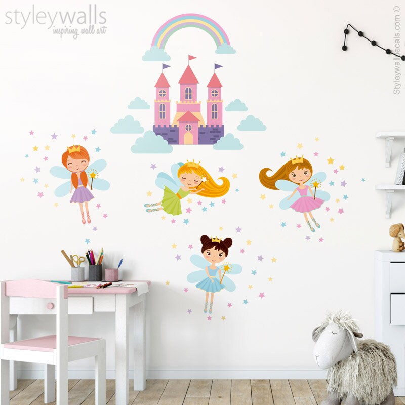 Fairy Wall Decal, Fairies Wall Decal Sticker, Princess Wall Decal Decor, Castle Wall Decal, Rainbow Stars Girls Nursery Room Decor Wall Art