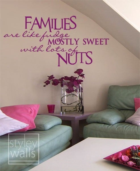 "Families are like fudge, mostly sweet with lots of Nuts" vinyl lettering measures 25.6" wide by 12" high.