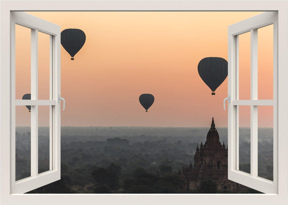 Hot Air Balloons Wall Decal Wall Sticker, 3d Window View Wall Sticker, Air Balloons Wall Mural, Window Frame Sticker, Window View Home Decal