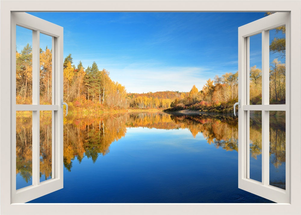 Lake View Wall Decal, 3d Window Wall Decal, Nature Wall Sticker, Trees Wall Decal, Window Frame, Window View Wall Mural, Home Decor Mural