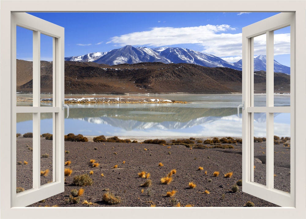 Mountains and Lake Wall Decal, Mountains View with Snow Wall Sticker, 3d Window Wall Decal, Nature Mountain Window Frame Wall Decal