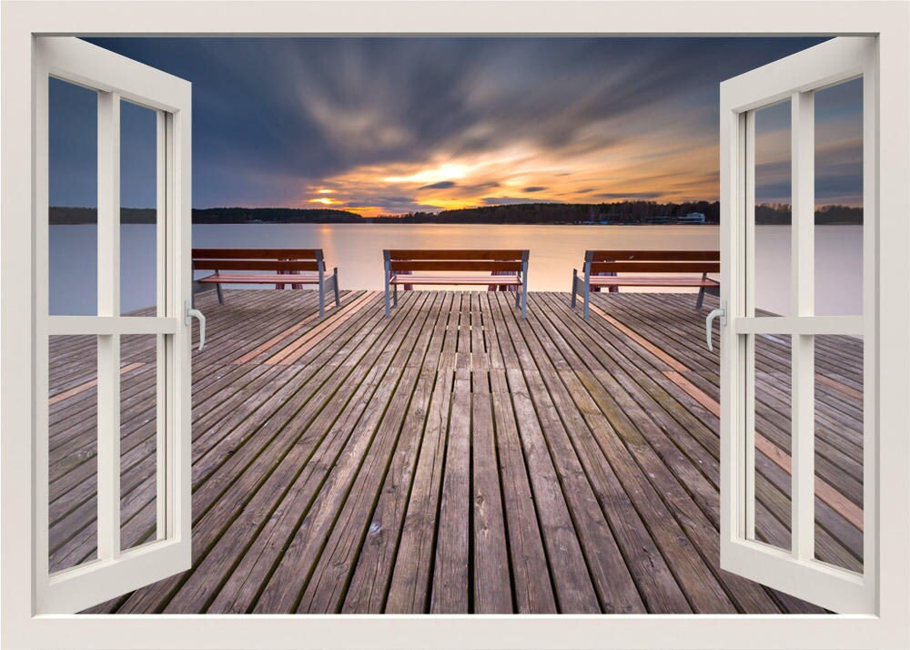 Sunset Wall Decal, Lake Landscape View Wall Decal, 3d Window Wall Decal, Window Frame, Sunset from Window View Home Decal, Wall Mural