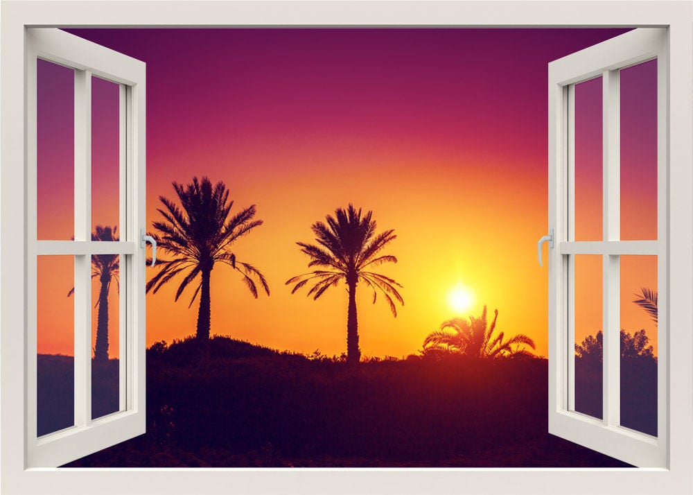 Sunset Wall Decal, Landscape View Wall Decal, 3d Window Wall Decal, Palm Trees Window Frame, Sunset from Window View Home Decal, Wall Mural